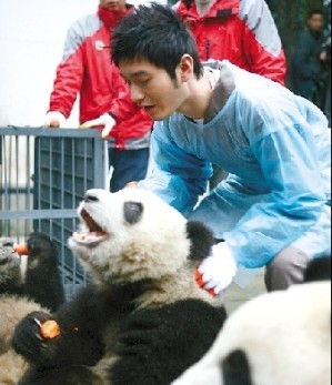 昨日,由臥龍中國(guó)保護(hù)大熊貓研究中心精心遴選的10只大熊貓,從該中心雅安碧峰峽基地啟程前往助陣上海世博。作為“中國(guó)保護(hù)大熊貓研究中心熊貓愛心大使”的黃曉明,同時(shí)又是成都和雅安的熊貓愛心大使,以及上海世博會(huì)志愿者宣傳大使,特意向劇組告假趕到雅安現(xiàn)場(chǎng)。此行他不僅是為了宣傳保護(hù)大熊貓和世博,最重要的是為了來替自己的一雙“兒女”送行。原來由他出資百萬元認(rèn)養(yǎng)的地震后出生的全球首對(duì)雙胞胎大熊貓“平平”、“安安”這次就將以“哥哥”、“姐姐”的身份帶領(lǐng)另外8只熊貓遠(yuǎn)赴上海世博。(春城晚報(bào))