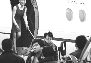 下午3:20,成龍的飛機(jī)降落在機(jī)場(chǎng)。幾名工作人員先行下機(jī),警覺(jué)地四處環(huán)顧,一眼就看到了攝影記者手中的相機(jī),立刻上前阻止:“成龍大哥沒(méi)有化妝,頭發(fā)很亂,還有白頭發(fā),你不能拍!