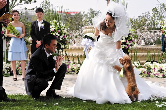 王學(xué)兵和孫寧別有新意地用他們的愛犬充當(dāng)傳遞愛的使者,由愛犬將結(jié)婚戒指帶到現(xiàn)場。交換結(jié)婚戒指后,王學(xué)兵與孫寧舉起香檳向親友祝酒。