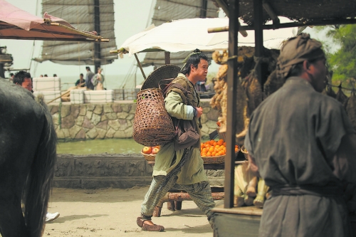 小沈陽的第一場重頭戲是他所扮演的小鞋匠在碼頭上巧遇一位白胡子老翁,受其一番指點(diǎn)和教導(dǎo),這位老翁也是江湖一位武俠高手,之后和趙本山所扮演的河盜一起把武功秘籍傳授給小沈陽。這場戲選擇在無錫影視基地的太湖碼頭拍攝,碼頭邊停靠著數(shù)艘巨大的帆船,小沈陽進(jìn)入狀態(tài)非?,這場戲拍攝得也相當(dāng)順利,連在旁觀看的趙本山也忍不住面帶微笑。