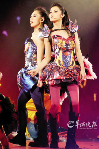 前晚的演唱會(huì)場(chǎng)面相當(dāng)華麗,TWINS一共換了五套華服,每套都以不同的主題場(chǎng)景配襯,絕對(duì)凸顯“女人味”。一開(kāi)場(chǎng),兩人以“冰雪女王”的科幻裝束亮相,取“破冰重出”之意;接著是“小蜜蜂”昆蟲(chóng)造型,寓意“辛勤勞作望有所獲”;然后是“絢麗大花”小短裙,顯示兩人如花般“美麗綻放”;還有“芭比娃娃”俏麗打扮,取意“依然經(jīng)典可愛(ài)”;第五套服裝是夸張“鹿角”配黑白短裙,在《下一站天后》的歌聲中再次展開(kāi)對(duì)“天后夢(mèng)”的追逐……直到返場(chǎng)時(shí),她們才換回樸素的灰色短裙,裙子上印著她們此次演唱會(huì)各自的造型,似乎又回到了現(xiàn)實(shí)。