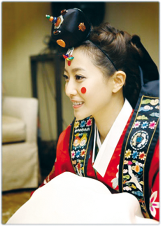 金喜善在自己的主頁上公開的這張相片中身穿韓國傳統新娘禮服,臉上印著胭脂印記,滿臉都是幸福的微笑,金喜善在發布這張相片時也不忘向給自己買這身衣服的婆婆表示了謝意。(姜恩真)