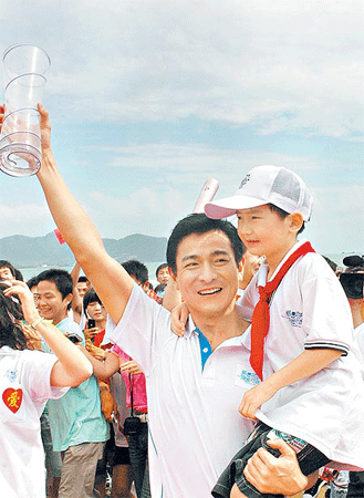 中新網6月6日電 據臺灣媒體報道,劉德華(華仔)日前帶著80名災區小朋友,參加在海南島三亞灣舉辦的“汶水入!彼拇ㄙc災活動。華仔與小朋友玩起5人6腳在500米長的沙灘上進行接力傳遞,華仔最后還抱起1名災區小朋友,將象征愛心與祝福的汶川之水舉起倒入大海,完成儀式。