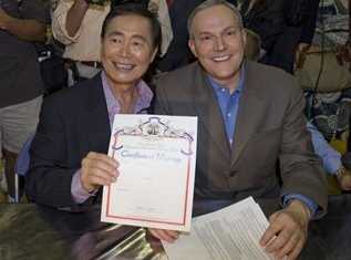 在人群中,最引人注目的就是曾經(jīng)在影集《星際迷航》演出蘇魯一角的的日裔演員竹井喬治,他和多年伴侶布萊德-阿爾特曼(Brad Altman)終于可以合法結(jié)成連理。