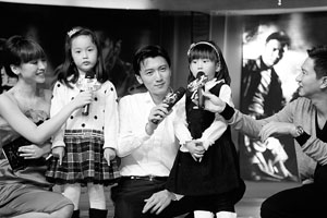 而張家輝直接來硬的:“我不是壞人,你過來。”張開雙臂去抱兩個孩子,結果兩個孩子都躲到了謝霆鋒身邊。謝霆鋒摟著兩個孩子哈哈大笑。 文并攝/記者壽鵬寰
