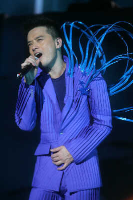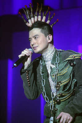 與其他流行歌手的演唱會(huì)相比,昨夜的上海大舞臺(tái)并未爆滿,但好在滿場(chǎng)都是黃耀明以及“人山人海”的死忠粉絲,所以當(dāng)周耀輝、當(dāng)李端嫻、當(dāng)AT17的ELLEN以及林一峰等人陸續(xù)入場(chǎng),均收獲了粉絲的熱情尖叫。整個(gè)現(xiàn)場(chǎng)猶如“人山人海”與家人的節(jié)日聚會(huì)一般熱鬧,還未開場(chǎng),內(nèi)場(chǎng)前區(qū)已經(jīng)擠滿了隨著音樂(lè)跳躍的歌迷。當(dāng)燈光全部暗下,伴隨著歌迷熱情的歡呼聲,黃耀明猛然出現(xiàn)在舞臺(tái)正中,幕布尚未全部拉開,身著白色羽毛褲的黃耀明唱起歌曲《下世紀(jì)再嬉戲》。戴著黃耀明經(jīng)典的妖精耳朵或者頭頂白色長(zhǎng)發(fā)的歌迷們開始集體大聲跟唱。或許對(duì)于不少死忠歌迷而言,這場(chǎng)演出仍然伴隨著許多遺憾,比如黃耀明的造型在早前許多演唱會(huì)上用過(guò),開場(chǎng)的帽子曾在“滿天神佛”演唱會(huì)上用過(guò),羽毛褲則曾在“光天化日”演唱會(huì)上穿過(guò),而后換上的第二套衣服也曾在“達(dá)明一派為人民服務(wù)”演唱會(huì)上用過(guò)。但每當(dāng)他下臺(tái)換裝,場(chǎng)內(nèi)便會(huì)響起一陣陣期盼的歡呼聲,甚至有歌迷干脆對(duì)著停下來(lái)與歌迷打招呼的黃耀明大喊:“講廣東話!”對(duì)歌迷而言,能夠一次看到“滿天神佛”、“光天化日”以及黃耀明與港樂(lè)合作的三場(chǎng)演唱會(huì)的精華,也算是不虛此行。
