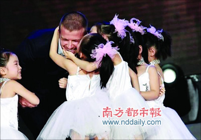 日前,貝克漢姆在北京參加錄制湖南衛視《快樂大本營》中國獨家球迷見面會特別節目。現場要送給貝克漢姆一份大禮,只見10個穿著白裙子的小女孩魚貫而入,這些看上去只有四五歲大的小姑娘一個個都雪白粉嫩、可愛得如同小公主,小貝愣在那兒,猜不出禮物是什么。何炅揭曉謎底了:“小貝和維多利亞一直想生個女兒,今天來了這么多小女孩,就當給小貝沾點喜氣吧。”貝克漢姆聽完翻譯的解釋非常高興,蹲下身子摟著小女孩一個個親過來,非常溫柔。