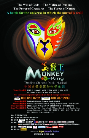 定位為搖滾動作音樂劇,又要與中國傳統音樂元素相結合,羅啟仁說到音樂上的特點很興奮:“《美猴王》的音樂創作者周佼佼很年輕,作為奧運會期間首演的大劇用一位學生級的作曲,很多人不能認同。我不認為年輕不行,我有我的勇氣。因為搖滾是年輕人的范圍,如果找一位很大年紀的人來弄搖滾,是‘搖’不出來的。音樂是中國類型的搖滾,是特別新鮮的,西方都沒有這類的作品。吉他和琵琶的二重奏、與古箏的二重奏等,還有美聲的唱法,大概十首歌,聽起來很不錯。”