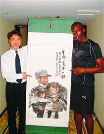牙買加飛人博爾特在奧運(yùn)會百米決賽中以9秒69震驚世界,昨日記者獲悉,博爾特與山東濟(jì)寧的一位農(nóng)民畫家還有一段小故事——— 奧運(yùn)開幕前夕,博爾特隨牙買加體育代表團(tuán)在天津訓(xùn)練時,濟(jì)寧畫家房貽德特意托人向博爾特贈送了一幅抗震救災(zāi)題材國畫,博爾特欣然接受,并回贈了一件他的簽名運(yùn)動服。