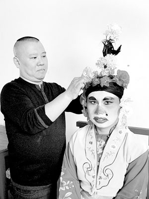 日前,德云社相聲劇《唐伯虎點秋香》在大興的一個影棚內拍完定裝照。幾乎所有演員的化裝都是郭德綱親自上手。