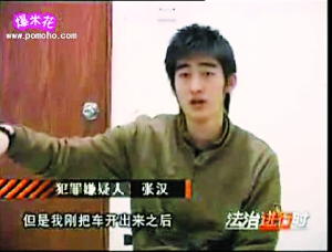 節目的字幕顯示,肇事者名叫“張漢”,這正是張翰在中戲就讀時使用的名字。而張翰在審訊室接受審問時也承認了自己的過錯并描述事發經過:“我只想讓他下去,我踩了三次剎車,我說‘你別拽我!’,我也怕他出事。”他強調,因為自己的情緒不佳才釀出事故:“因為當時我情緒比較激動,有許多下意識的行為,當時沒有想那么多,但是我剛把車子開出來(指把警察的手甩出窗外之后),就意識到事情鬧大了。”