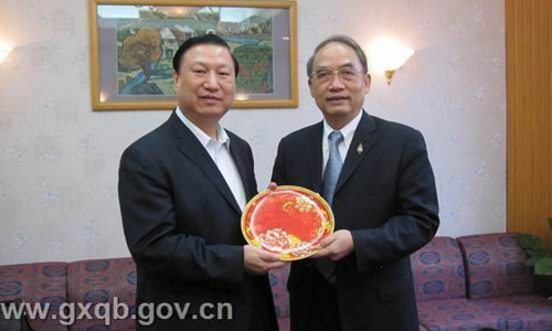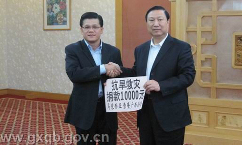 3月26日,馬來西亞雪隆廣西會(huì)館和泰國(guó)廣西總會(huì)永遠(yuǎn)名譽(yù)會(huì)長(zhǎng)饒培中到訪廣西,馮祖華接待了到訪的客人,向他們通報(bào)了廣西的旱情,馬來西亞雪隆廣西會(huì)館和泰國(guó)廣西總會(huì)永遠(yuǎn)名譽(yù)會(huì)長(zhǎng)饒培中當(dāng)即分別向廣西災(zāi)區(qū)捐款一萬元和一千元。