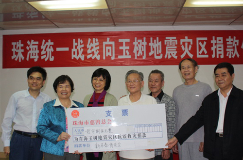 中新網4月22日電 據珠海外僑局消息,4月20日下午,廣東省珠海市委統戰部在三樓大廳舉行為青海玉樹地震災區捐款儀式,珠海市新馬泰的僑友在副會長車玉屏、張舉安的帶領下共捐款2800元,為青海玉樹地震災區獻上珠海特區僑友的一片愛心。
