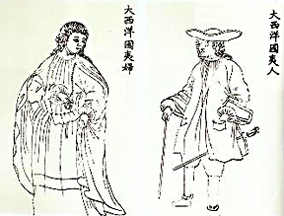 1751年,乾隆皇帝下令編撰《皇清職貢圖》一書時(shí),由中國(guó)宮廷畫師描繪的葡萄牙男人、婦女的形象。 |