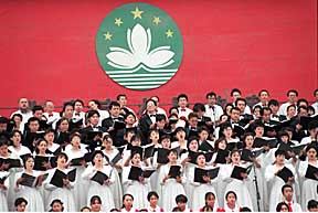 天安門廣場迎澳門回歸100天大型音樂會 作者:鄒憲 北京十五家文藝團體十日下午在天安門廣場舉行“迎澳門回歸倒計時一百天大型音樂會”。來自香港、澳門和內地近千名歌唱家在澳門特區區徽下高歌《歡樂頌》。 |