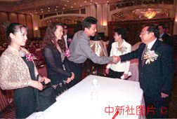 中新社傳真 毛建軍 攝 二十七集電視連續劇《澳門的故事》首映式九日在澳門舉行,這是中國中央電視臺為迎接澳門回歸而精心制作的重點劇目。新華社澳門分社社長王啟人(右)在首映式上向劇中主要演員(左起)李琳、趙越、佟凡表示祝賀。 |