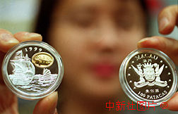 北京展示加拿大為澳門回歸制作紀(jì)念銀幣 作者:鄒憲 99北京國(guó)際錢幣博覽會(huì)十一日開幕,來(lái)自二十多個(gè)國(guó)家和地區(qū)的近七十家廠商展示了各自的錢幣精品。圖為"加拿大皇家造幣廠"為澳門回歸中國(guó)而發(fā)行的精鑄紀(jì)念銀幣(正反面),出售價(jià)為680元,發(fā)行38888套。 |