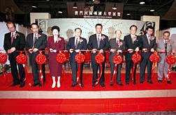 中新社傳真 毛建軍 攝 澳門回歸祖國大型展覽十一日在澳門開幕,澳門特區首任行政長官何厚鏵、新華社澳門分社社長王啟人、澳門中華總商會會長馬萬祺等嘉賓為展覽剪彩。 |