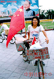 中新社傳真 陳文 攝 湖南省武崗二十五歲的農(nóng)民李孝富為迎接澳門回歸,騎自行車十五個月,行程約三萬八千公里,十一月十二日抵達(dá)深圳。 |