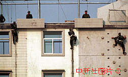 中新社傳真 毛建軍 攝 解放軍駐澳門部隊戰士作攀墻訓練表演。 |