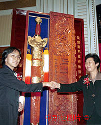 中新社傳真 毛建軍 攝 為慶祝澳門回歸祖國,河南省旅游局與登封市人民政府將一柄制作精良、重五十斤的特大型少林寶劍贈送給澳門人民。圖為河南省旅游局副局長方洪蓮(右)向澳門政府旅游司代司長文綺華贈送寶劍。 |