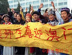 民族大學生迎澳門回歸 作者:趙振清 北京中央民族大學的師生們十日上午在校園內用各民族文字書寫喜迎澳門回歸橫幅,迎接這一大喜日子的到來。 |