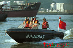 在澳門與珠海一衣帶水的內(nèi)河上,巡羅的中國武警快艇官兵向澳門游船上的中外客人招手致敬。 中新社傳真 賈國榮攝 |