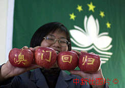 產(chǎn)自陜西黃土高原的延安蘋果,被映上 慶祝澳門回歸字樣作為禮品送抵澳門。中新社數(shù)碼傳真 王瑤攝 |