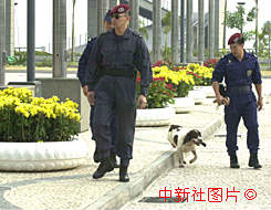 中新社數(shù)碼傳真 賈國榮攝 澳門特警隊員帶領(lǐng)警犬在政權(quán)交接場地四周巡羅檢查。 |