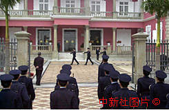 中新社數碼傳真 彭偉祥攝 16日上午,在蒙蒙細雨中的澳督府門前舉行降旗演練儀式。