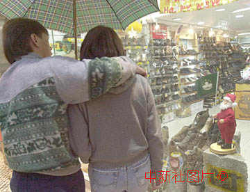 中新社數碼傳真 賈國榮攝 澳門一家商店特意讓圣誕老人玩具手握特區區旗歡迎回歸,引起一對情侶的好奇。 |