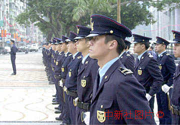中新社數碼傳真 彭偉翔攝 澳門警方儀仗隊為參加政權交接和回歸慶典的多項活動,加緊進行演練。 |