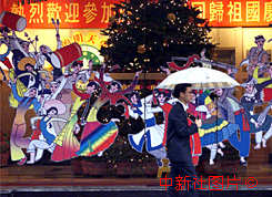 中新社傳真 宗金柱攝 澳門十六日細雨菲菲,一位行人打傘走過一家酒店裝飾有迎回歸彩畫的玻璃門前。 |