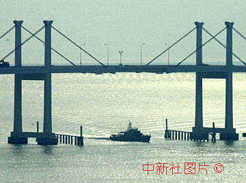 中新社數碼傳真 賈國榮攝 中國軍艦航行在澳門回歸交接儀式場地附近的友誼大橋下,保證海域和交通的平安。 |