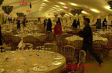 澳葡政府告別酒會正在緊張準(zhǔn)備,服務(wù)生十八日在宴會廳內(nèi)反復(fù)練習(xí)上菜程序。 中新社傳真 毛建軍攝 |