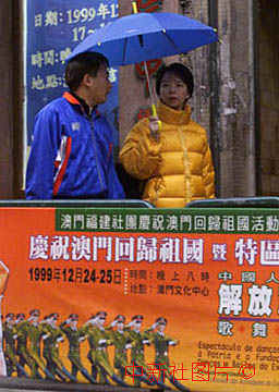 澳門民間的慶回歸活動陸續展開,預告解放軍歌舞團演出的海報出現在大街小巷。中新社傳真 宗金柱 攝