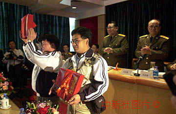 澳門日報記者(右一)代表解放軍進駐澳門部隊隨軍記者團,18日在珠海接受廣州軍區司令員陶伯鈞,政委劉書田頒發的紀念冊。中新社數碼傳真 王瑤攝 |