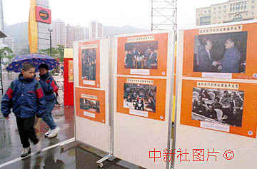 香港島各界聯合會十八日冒雨在維多利亞公園舉辦"慶祝澳門回歸祖國圖片展覽",展覽展示了中華民族從此洗脫屈辱的歷程和回歸前的澳門風貌。中新社傳真楊佐桓攝 |