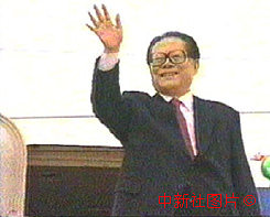 中國國家主席江澤民今天中午十二時許乘專機抵達(dá)澳門,步出機艙的一瞬向歡迎的人群招手致意。中新社傳真 |