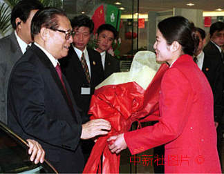 江澤民主席十九日中午抵達(dá)下榻的澳門濠景酒店,受到工作人員的熱情歡迎。 中新社傳真 毛建軍攝 |