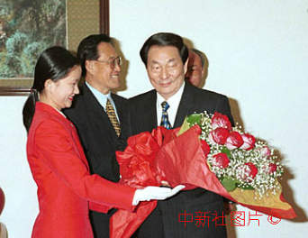 朱镕基總理十九日抵達澳門新竹苑賓館,禮儀小姐立即獻上一束鮮花。 |