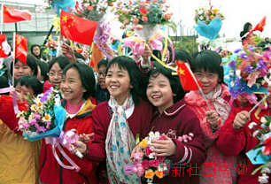 澳門兒童揮舞五星紅旗和花束,熱烈歡迎江澤民主席和朱镕基總理飛抵澳門出席政權交接儀式。中新社傳真 李剛攝 |