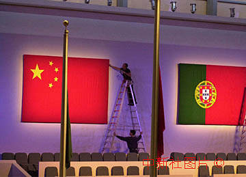 交接儀式即將來臨,工作人員一絲不茍的在整理國旗。中新社數(shù)碼傳真 毛建軍攝 |