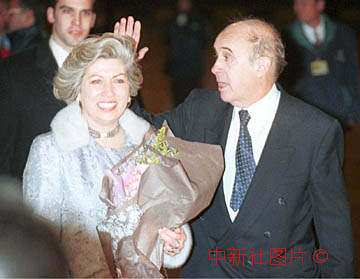 澳督韋奇立和夫人二十日凌晨參加完政權(quán)交接儀式后,登機(jī)飛離澳門(mén)前回首揮手告別。中新社傳真 賈國(guó)榮攝 |