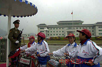 由天津老年人組成的夕陽紅自行車隊赴澳門宣傳團,18日到達解放軍駐澳部隊軍營為戰士送行。中新社數碼傳真 王瑤攝 |