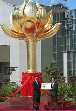 國(guó)務(wù)院副總理錢其琛二十日代表中國(guó)中央政府向澳門特區(qū)贈(zèng)送禮品--盛世荷花,并將禮品證書送到首任特首何厚鏵手中。 中新社傳真 宗金柱攝 |