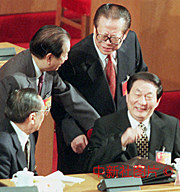 江澤民、朱镕基、李嵐清、錢其琛在九屆全國人大三次會議閉幕會上交談。